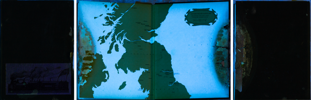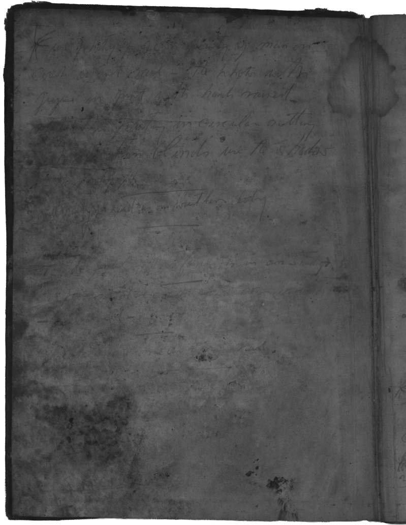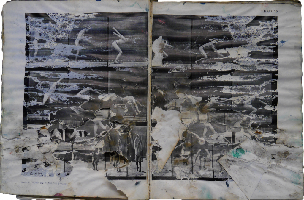 Bacon’s book of Muybridge’s photography has sustained the most damage of the four books treated. The book appears to have been well used by Bacon in his studio as it is covered in various artist materials. There has been aqueous damage to the book that has resulted in tidelines, planar distortions, losses, staining, and mould damage which caused weakened structural integrity. When paper is damp for a long time, it provides an environment for mould to thrive, which can lead to cellulolytic digestion: the fungi break down the cellulose in the paper using water, a process known as hydrolysis. Mould is unfortunately everywhere and has the potential to thrive in any place there is enough moisture, thus environmental controls are the most effective way to prevent mould growth and damage.