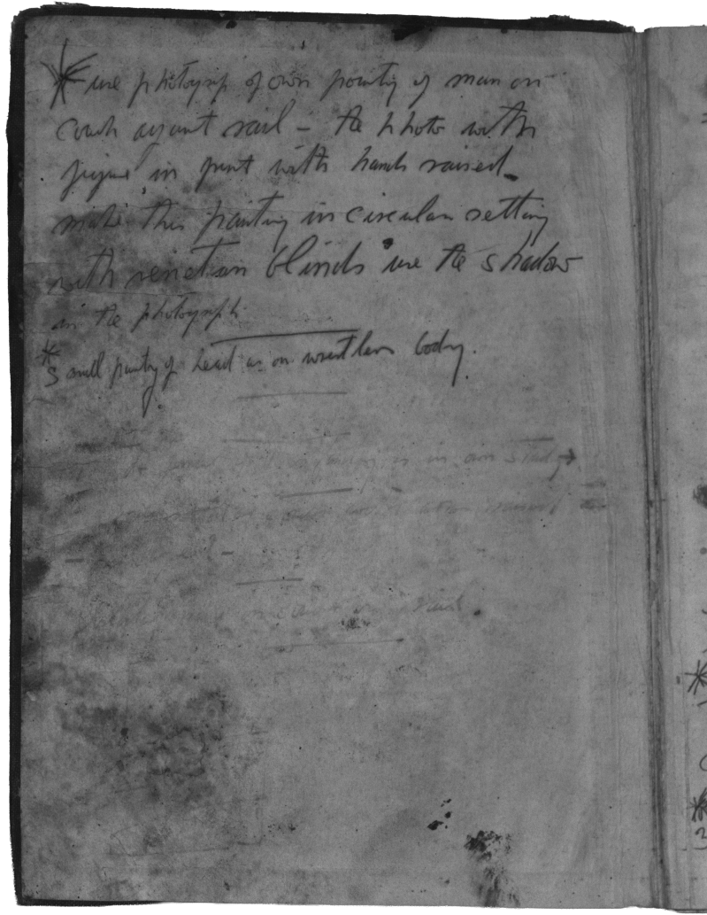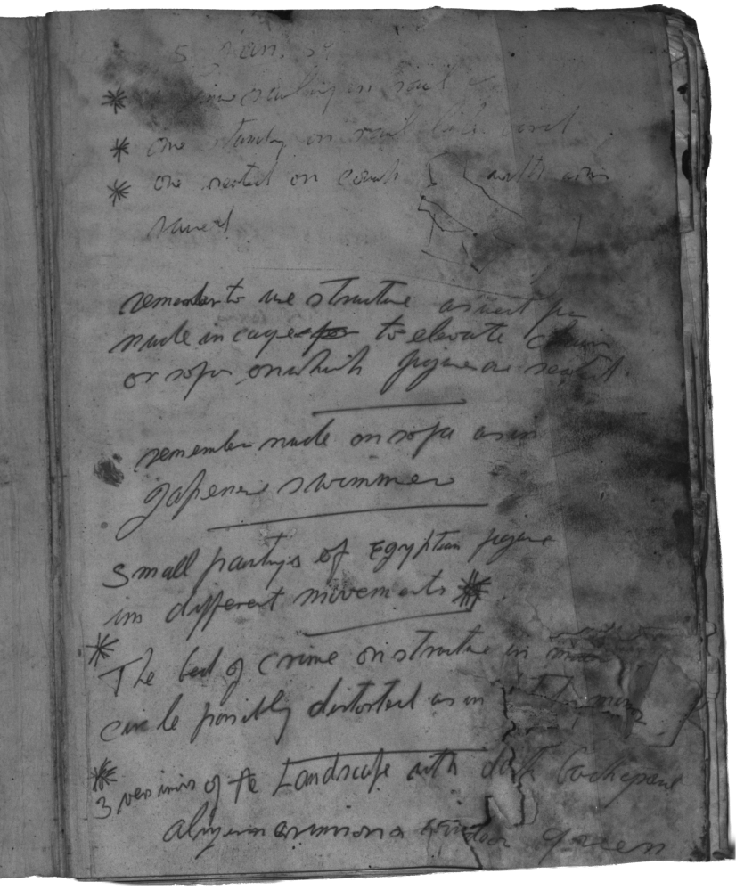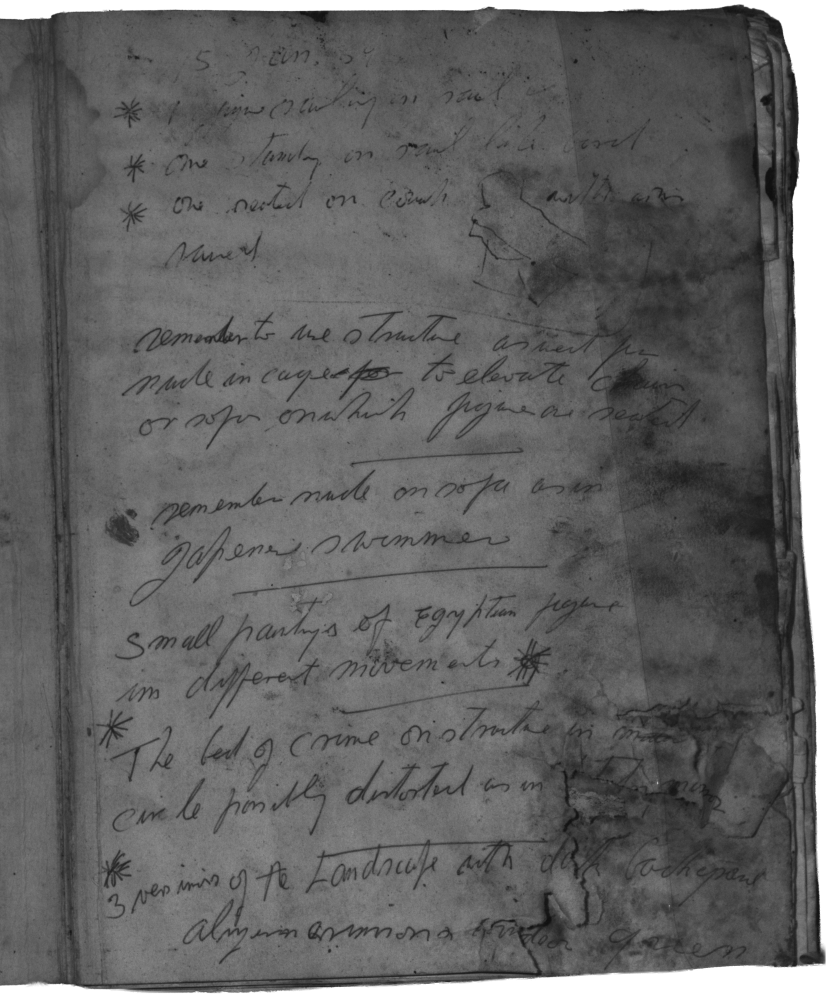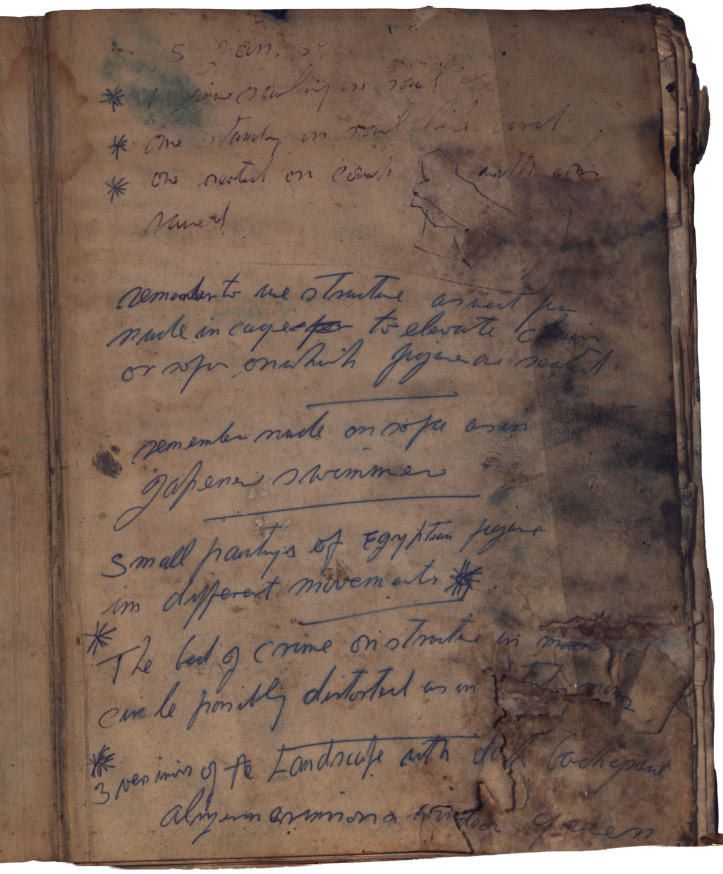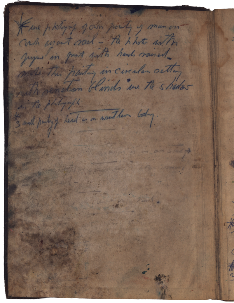 It appears that some adhered pages were forced open after the aqueous damage, resulting in significant losses, tears, and image defacement. Bacon may have continued to use this book despite its poor condition, and caused this damage himself. Thus, it was decided not to separate the laminated pages, as this would disrupt the book’s artistic history.