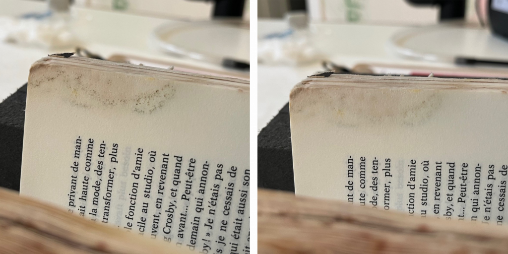 To remove the mould residue from the book, each page was vacuumed by brushing the spores towards a MuseumVac equipped with a HEPA filter. All work was conducted under a fume extractor in an isolated area for the safety of the conservator and to prevent contaminating other areas and objects. Staining is a common effect of mould and discolouration remains after mechanically removing the mould reside. Therefore, an object may not appear drastically different before and after this type of treatment.