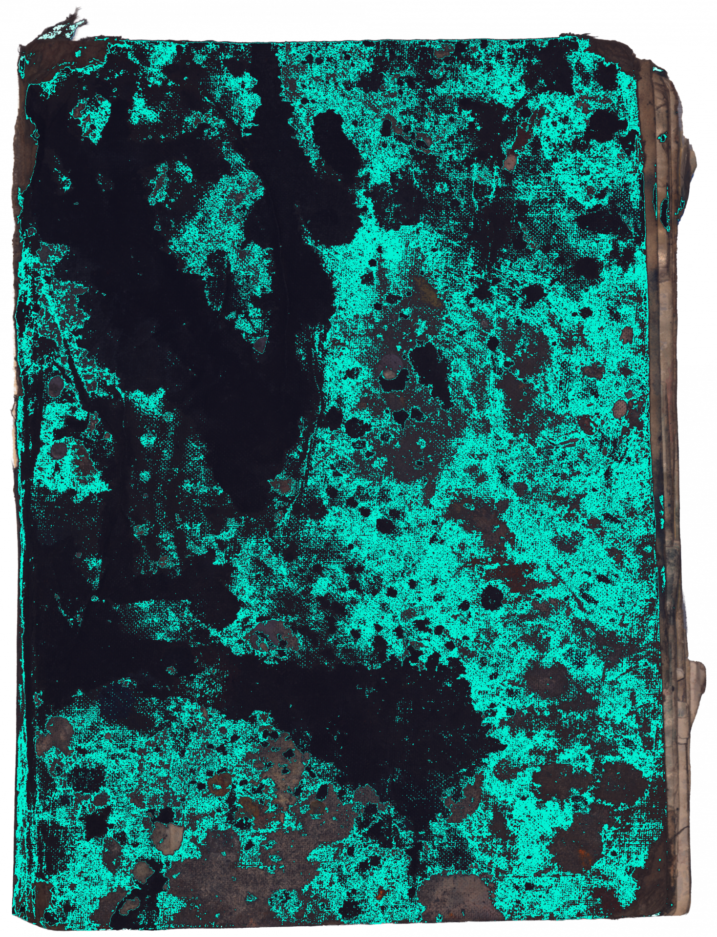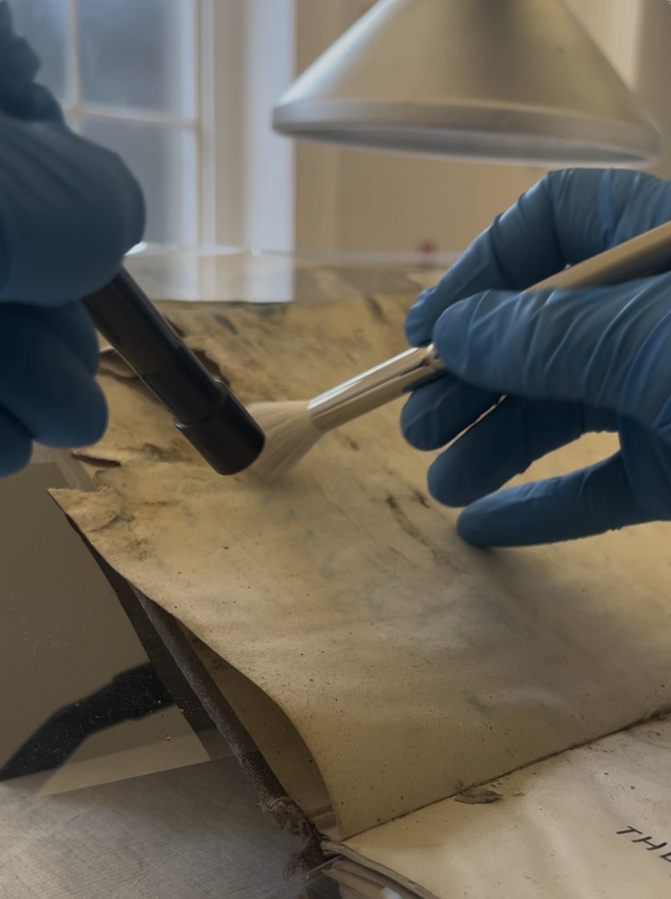In some cases, a conservator may opt to use an alcohol solution to treat mould; however, this was not deemed appropriate for objects in which pages were adhered together, as proper solubility testing could not be conducted without separating the laminated pages. If there was any media between the pages that could not be seen, an introduction of moisture could potentially cause the media to run and create further damage.